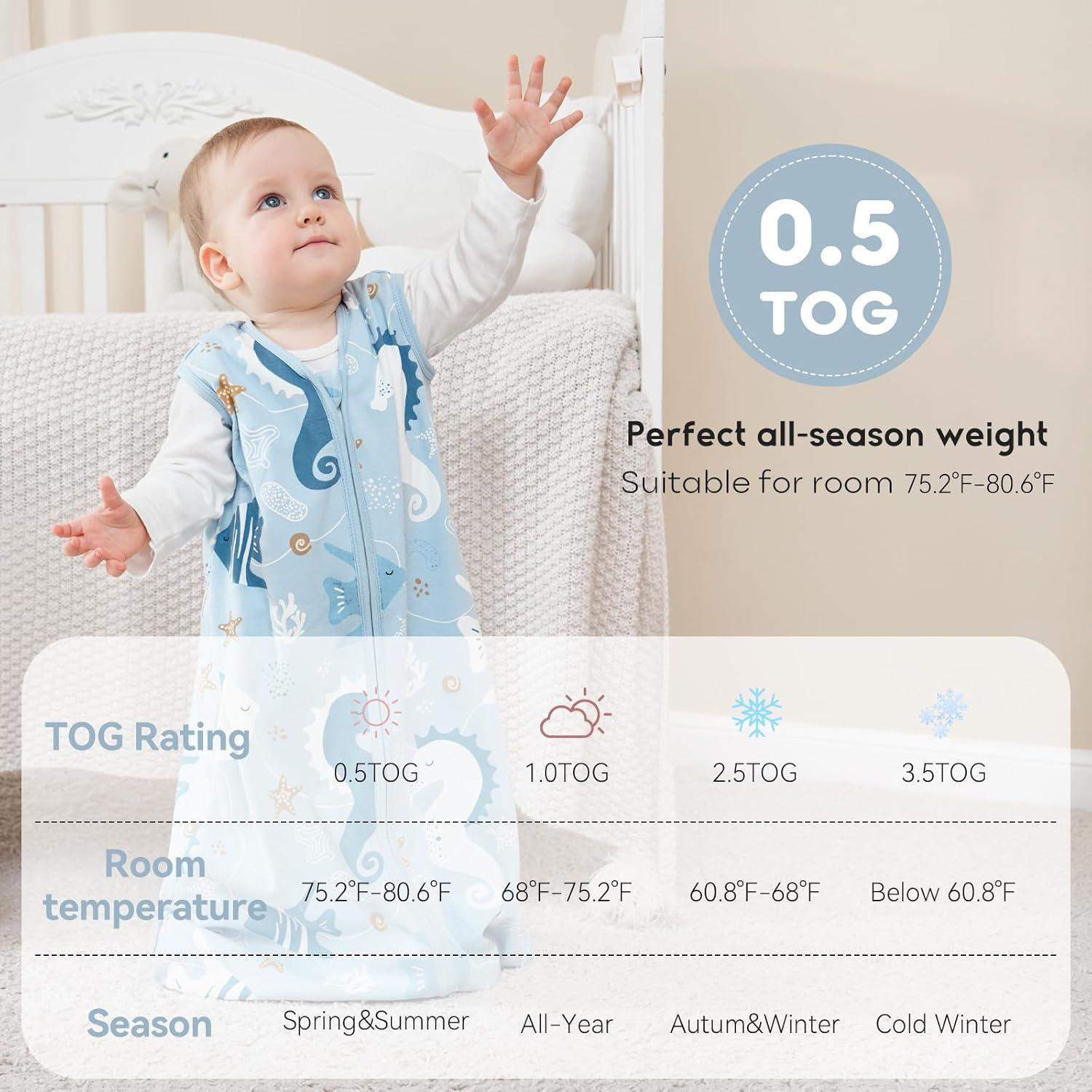 Lightweight 0.5 TOG – The baby sleep sack 0.5 Tog is suitable for moderate temperatures from 75 to 80°F as an ideal option for spring, summer, autumn or taking a nap in air-conditioned rooms, keeping your baby snug and warm.