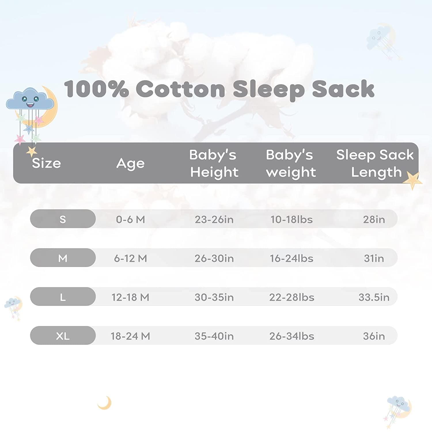 Essential Baby Item: Baby sleep sacks are good for everyday use, it will help baby get longer sound night’s sleep. There are 4 sizes available for your choices. S for 0-6 Months. M for 6-12 Months. L for 12-18 Months. XL for 18-24 Months. Please allow a little deviation in size.