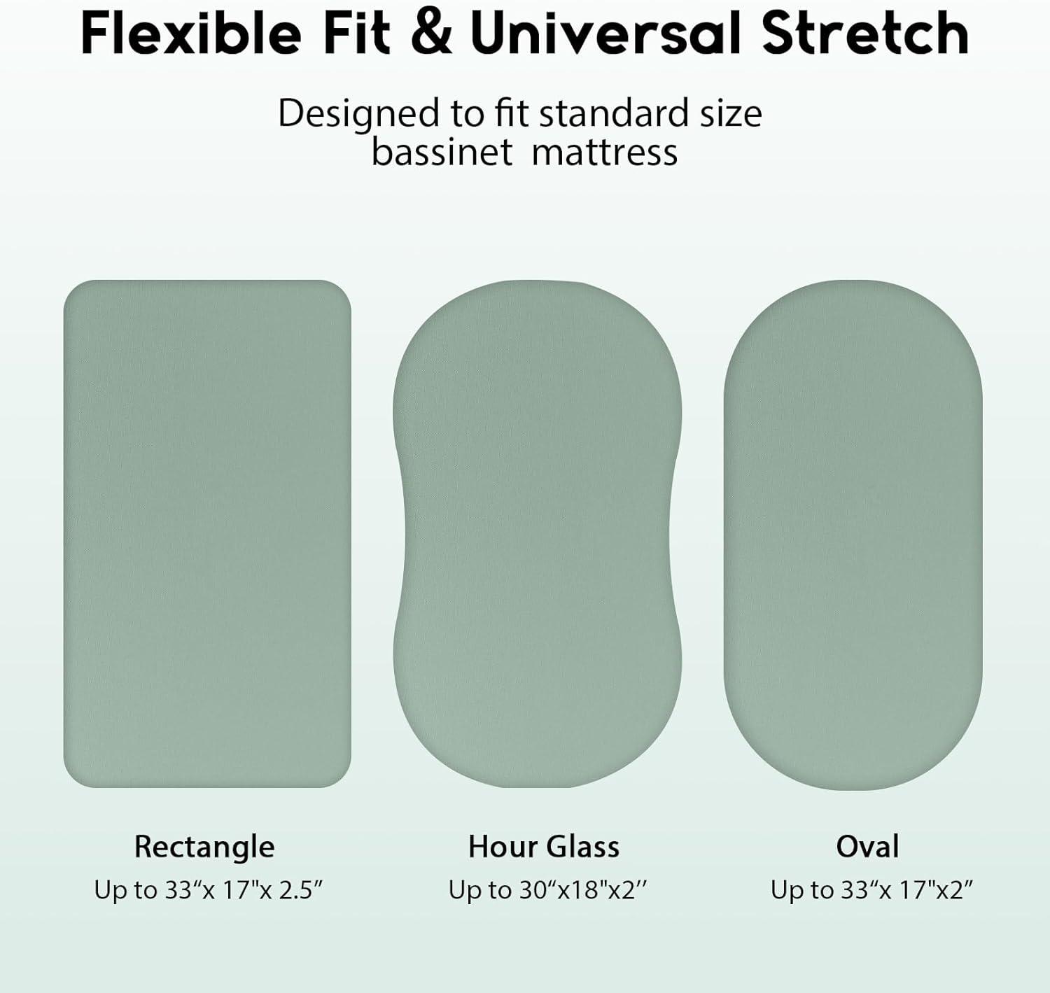 Perfect Size: Measured 32”X 16'', universal bassinet sheets perfectly are suitable for popular brand mattresses in various shapes, such as standard oval, round, rectangular, and hourglass. Bassinet sheets with 5-inch deep pocket provides full protection for your mattress and a comfortable sleeping environment for baby.